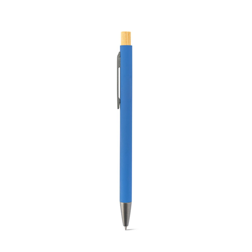 Təkrar emal edilmiş alüminium qələm, rezin örtük, bambuk düymə, mavi yazı, lazer qravirovka gümüş rəngdə. ø9 × 135 mm
